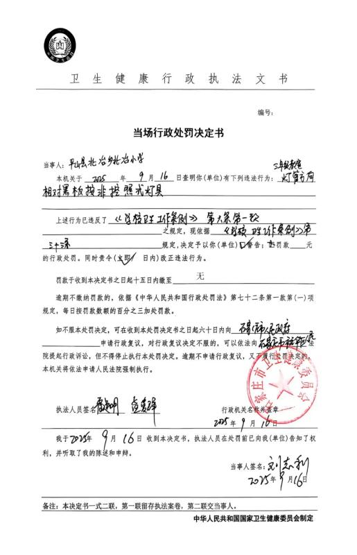 平山县北冶乡北冶小学违反《学校卫生工作条例》案