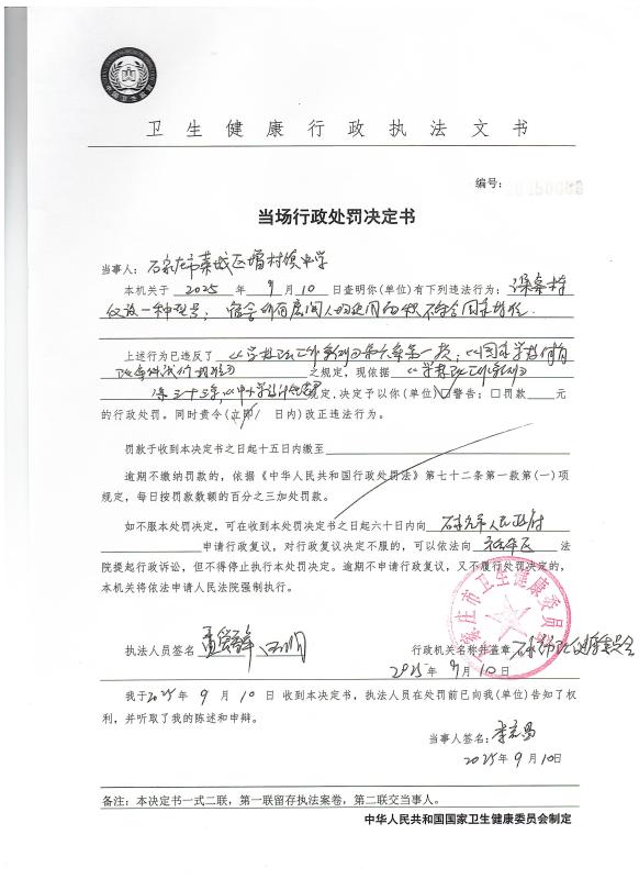 石家庄市藁城区增村镇中学违反《学校卫生工作条例》案