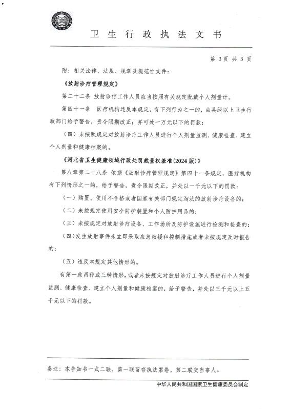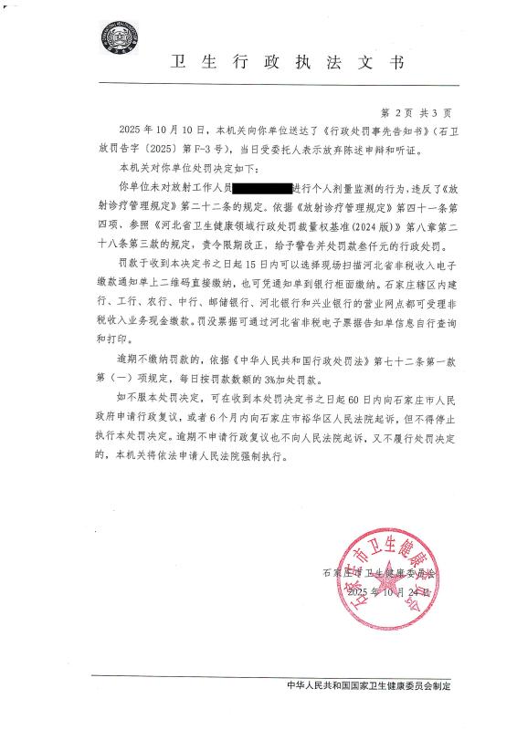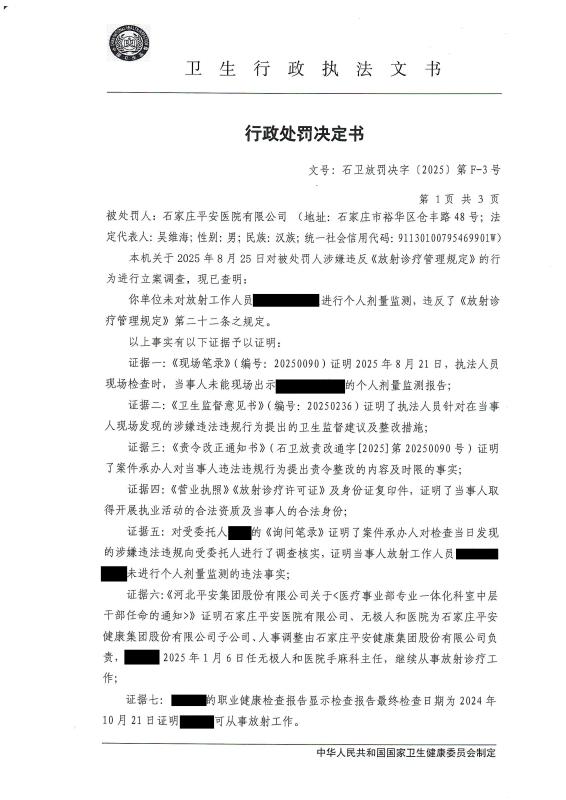 石家庄平安医院有限公司未按照规定对放射诊疗工作人员进行个人剂量监测案