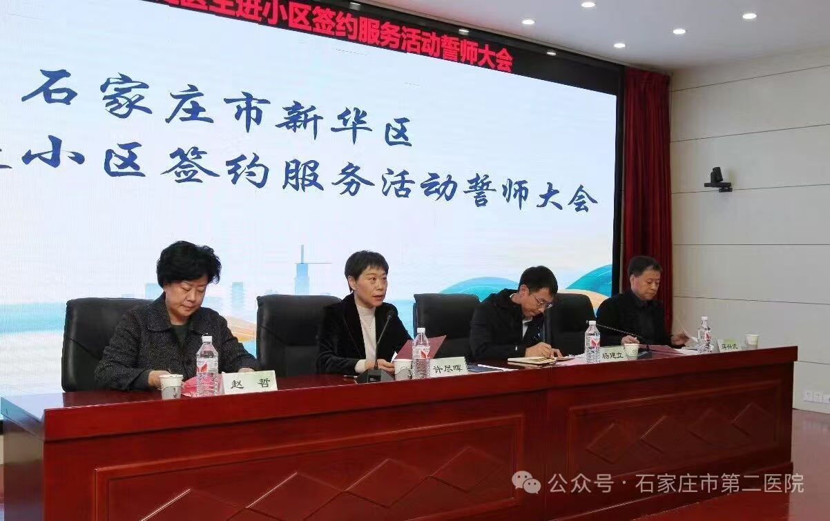 12月12日,新华区在石家庄市第二医院召开活动誓师大会。市卫生健康委党组书记、主任许尽晖,新华区政府副区长杨建立出席会议并部署工作。市第二医院组建的24个专家团队将与新华区181支家庭医生团队共同配合开展签约履约服务,上下联动、各司其职,充分发挥自身优势,打通优质资源下沉服务的最后一公里,通过优化团队、细化网格、丰富服务、规范履约等一系列举措,不断扩大签约覆盖面、增强居民感受度与满意度,使群众签约有感受、服务有“医”靠、健康更牢靠,逐步形成“基层首诊、双向转诊、急慢分治、上下联动”的分级诊疗模式。会议结束后,与会领导为家庭医生团队代表授旗。市卫生健康委副主任施文国、马战国,市直各医院、市主城区卫生健康局主要负责同志参加会议。各社区卫生服务机构负责人及家庭医生团队代表参加活动。