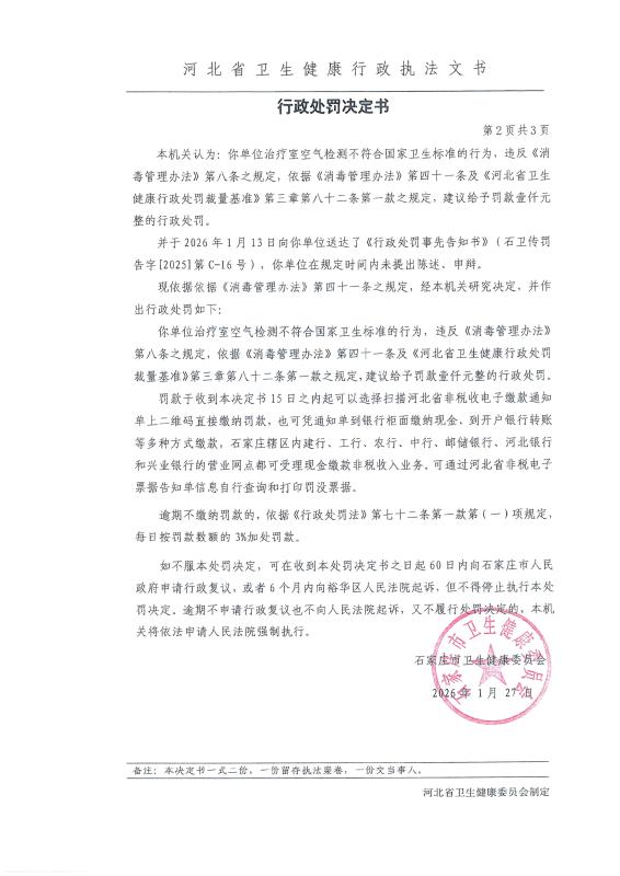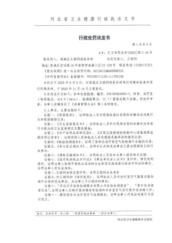 栾城区王锁利西医诊所医疗机构空气检测结果不符合国家卫生标准案